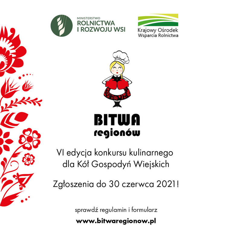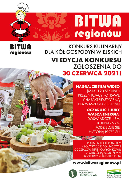 – Jesteśmy solidarni z rolnikami i dlatego przygotowujemy dania regionalne z lokalnych produktów, do czego zachęcamy Koła Gospodyń Wiejskich poprzez konkurs „Bitwa Regionów”. Tegoroczna, szósta edycja będzie odbywała się w warunkach trwającej epidemii COVID-19 i podobnie jak nasze życie przeniesie się częściowo do przestrzeni wirtualnej. Zapraszamy uczestniczki do prezentacji potraw w formie multimedialnej. Mamy nadzieję, że to wyzwanie będzie dla pań ciekawe – zachęca Grzegorz Puda, Minister Rolnictwa i Rozwoju Wsi.