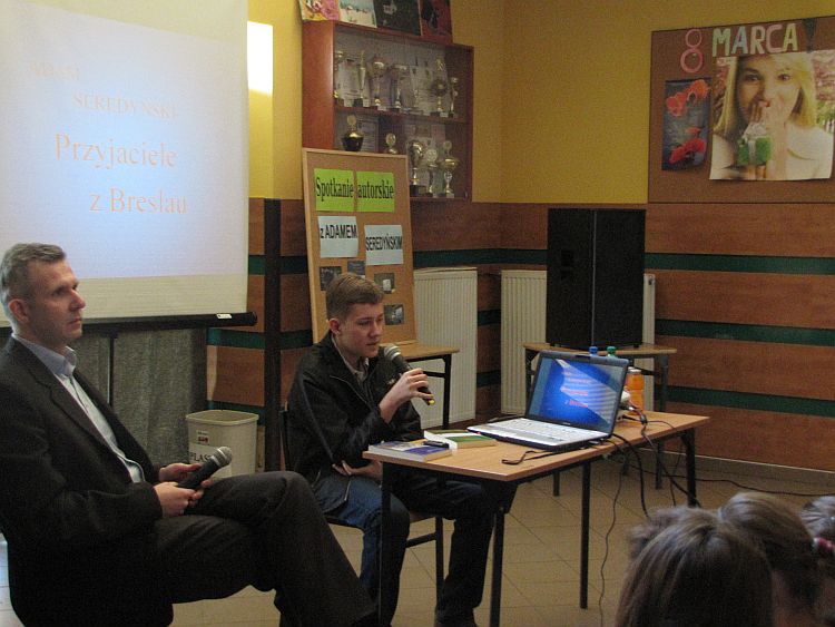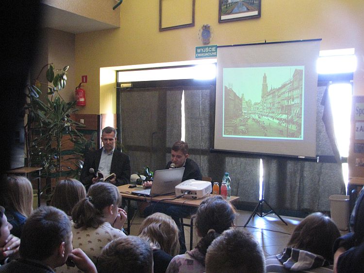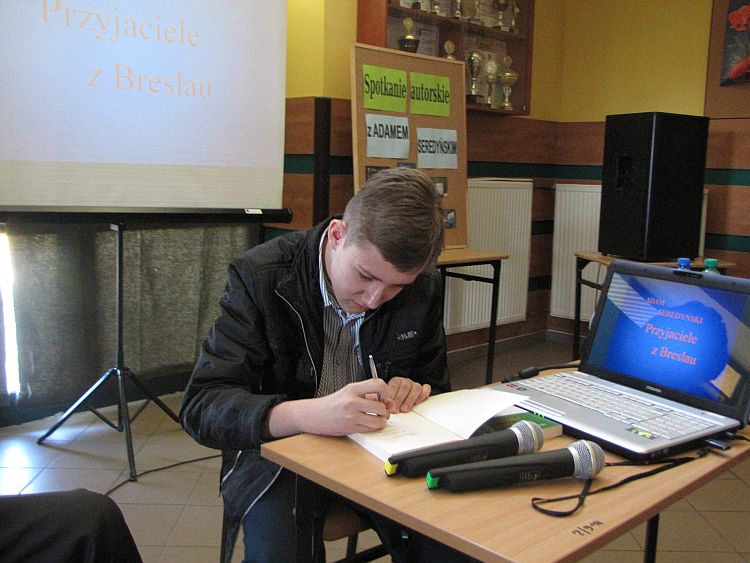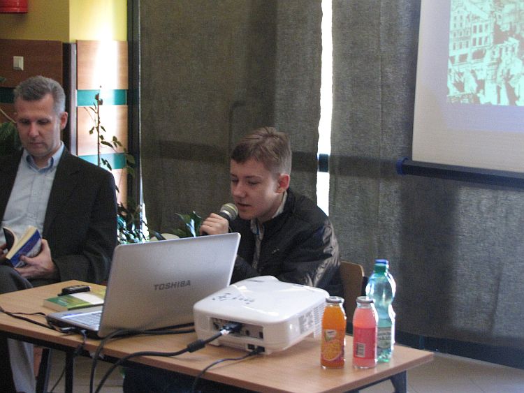 Młody pisarz przedstawił prezentację mulimedialną na temat swojej pierwszej książki pt. „Przyjaciele z Breslau”, którą napisał w wieku 12 lat. Jest to powieść historyczno-przygodowa, opowiada ona o przyjaźni trzech chłopców Polaka, Niemca i Żyda podczas II wojny światowej we Wrocławiu. Z bohaterami jego książki przemierzamy ulice Wrocławia (wtedy jeszcze mają niemieckie nazwy), przeżywamy przygody, poznajemy wojenną rzeczywistość, rozszyfrujemy zagadkę związaną z tajemniczą szkatułką.