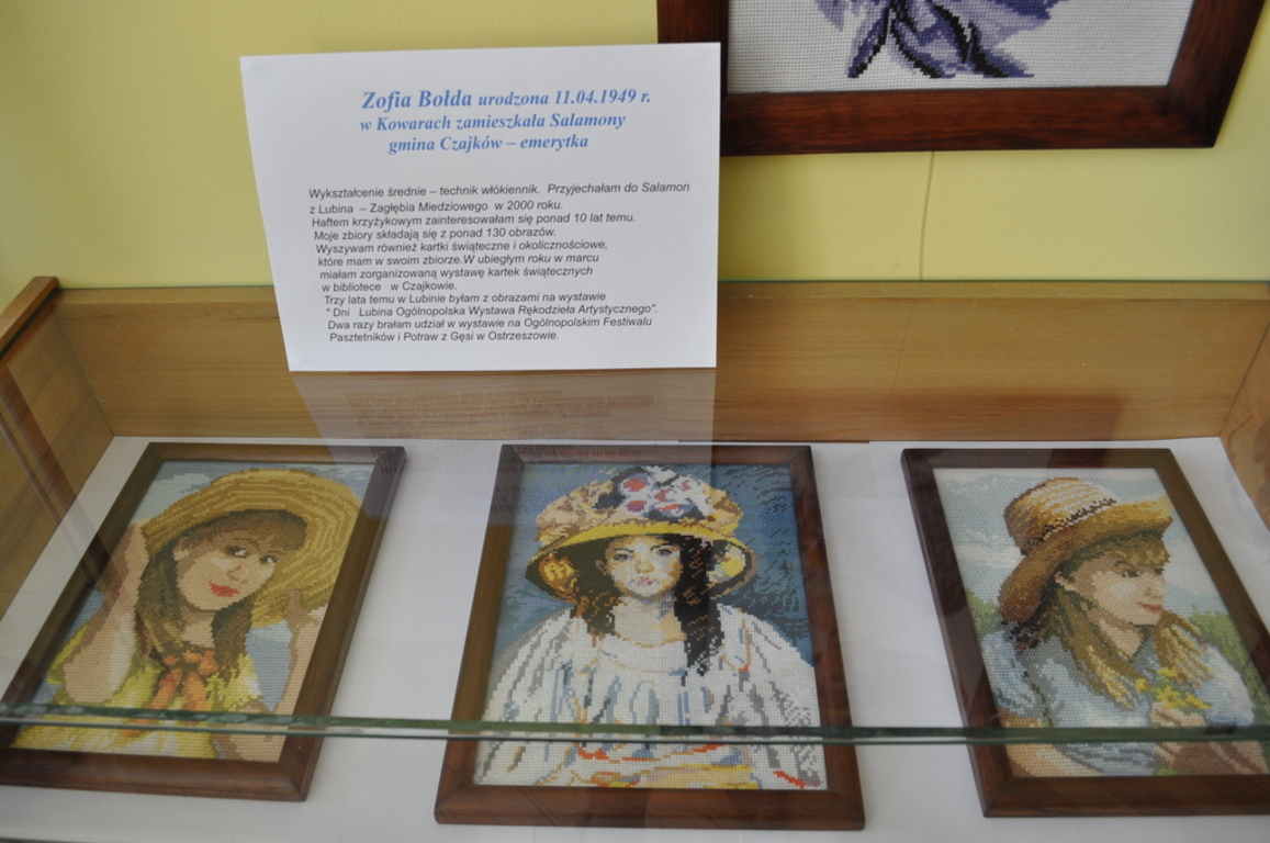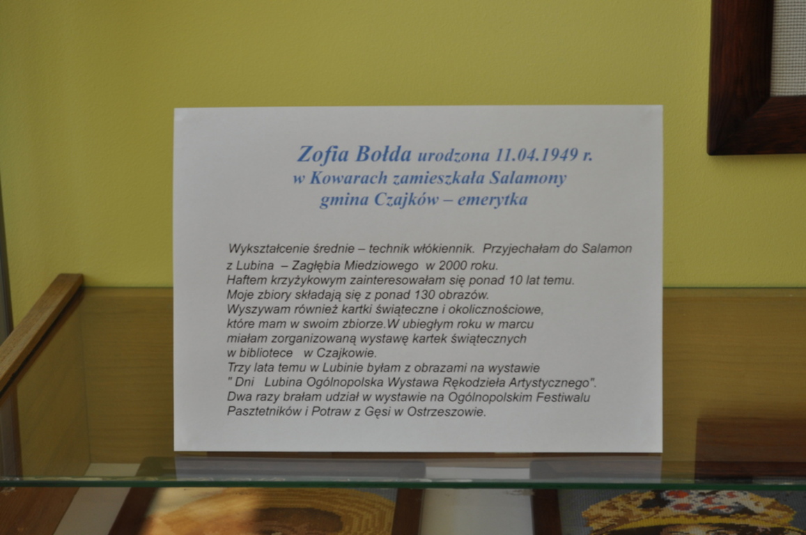 Zofia Bołda urodzona 11.04.1949 r. w Kowarach, zamieszkała Salamony, gmina Czajków, emerytka. Wykształcenie średnie - technik włókiennik. „Przyjechałam do Salamon z Lubina - Zagłębia Miedziowego - w 2000 roku. Haftem krzyżykowym zainteresowałam się ponad 10 lat temu. Moje zbiory składają się z ponad 130 obrazów. Wyszywam również kartki świąteczne i okolicznościowe, które mam w swoim zbiorze. W ubiegłym roku w marcu miałam zorganizowaną wystawę kartek świątecznych w Bibliotece Publicznej w Czajkowie. Trzy lata temu w Lubinie byłam z obrazami na wystawie \"Dni Lubina Ogólnopolska Wystawa Rękodzieła Artystycznego\". Dwa razy brałam udział w wystawie na Ogólnopolskim Festiwalu Pasztetników i Potraw z Gęsi w Ostrzeszowie.\"