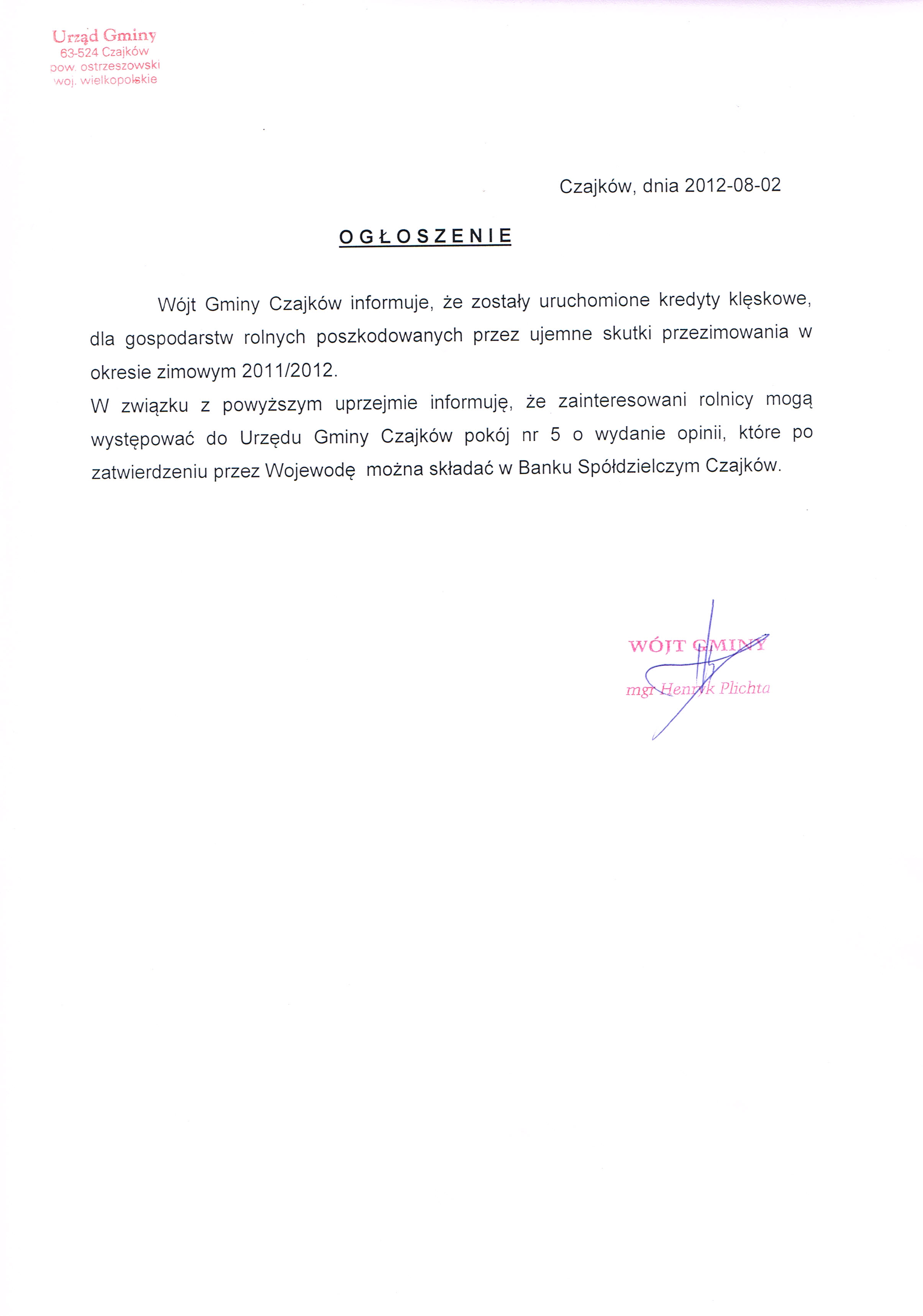 W związku z powyższym uprzejmie informuję, że zainteresowani rolnicy moga występować do Urzędu Gminy w Czajkowie pok. nr 5 o wydanie opinii, które po zatwierdzeniu przez Wojewódę można składać w banku spółdzielczym w Czajkowie.