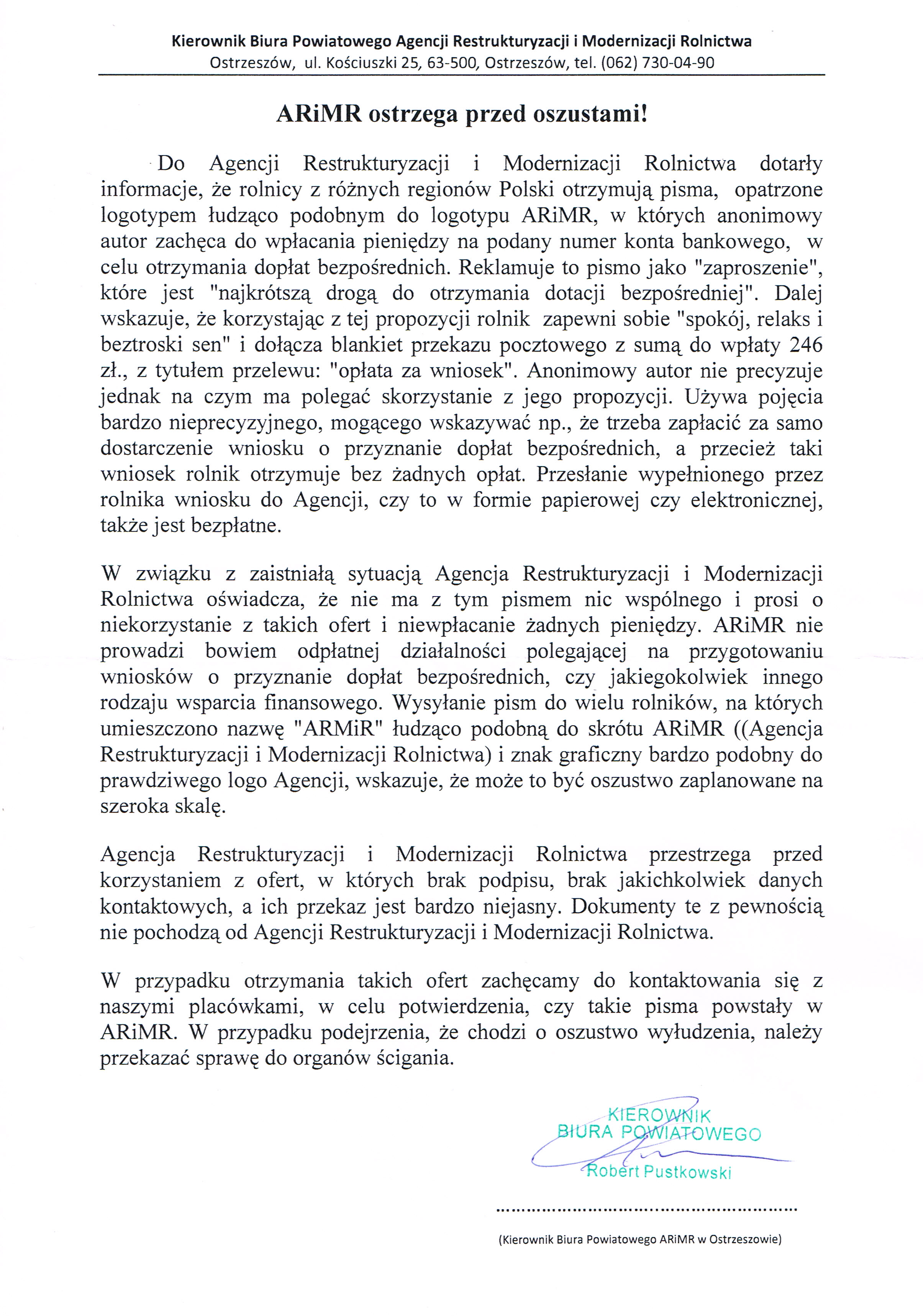 W zwiâzku z zaistniałą sytuacją Agencja Restrukturyzacji i Modernizacji Rolnictwa oświadcza, że nie ma z tym pismem nic wspólnego i prosi o niekorzystanie z takich ofert i niewpłacanie żadnych pieniędzy. ARiMR nie prowadzi bowiem odpłatnej działalności polegajâcej na przygotowaniu wniosków o przyznanie dopłat bezpośrednich, czy jakiegokolwiek innego rodzaju wsparcia finansowego. Wysyłanie pism do wielu rolników, na których umieszczono nazwę ARMiR łudzâco podobnâ do skrótu ARiMR ((Agencja Restrukturyzacji i Modernizacji Rolnictwa) i znak graficzny bardzo podobny do prawdziwego logo Agencji, wskazuje, że może to być oszustwo zaplanowane na szeroka skalę.