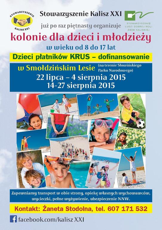 Stowarzyszenie Ludzi Dobrej Woli Ziemi Kaliskiej wraz ze Stowarzyszeniem KALISZ XXI są organizatorami wypoczynku letniego – kolonii dla dzieci i młodzieży. Dzieci których przynajmniej jeden rodzic lub prawny opiekun jest płatnikiem KRUS otrzymają DOFINANSOWANIE do kolonii.